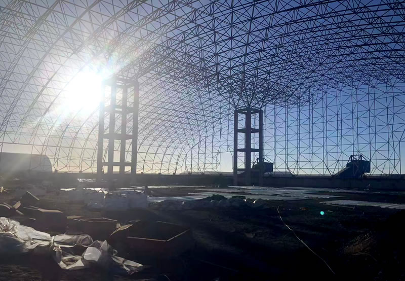 3、材料:正放四角錐螺栓球節點網架,按照甲方確認的圖紙設計要求加工制作。網架主材材質為Q355B鋼管,底漆二道70um,主檁條鍍鋅C型鋼C220*75*20*3.0,次檁條鍍鋅C型鋼C180*70*20*2.5,屋面板0.5mm厚彩鋼單板